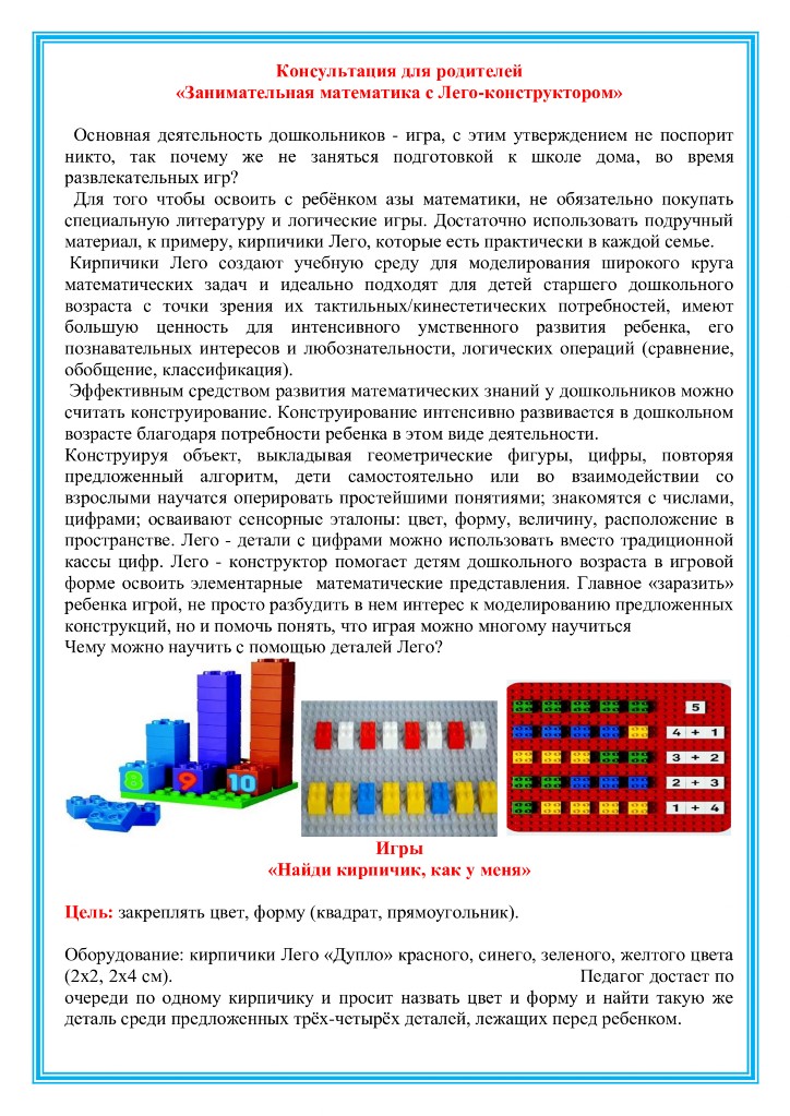 "Занимательная математика с Лего-конструктором" подскажет вам родители, как изучать математику в ненавящевой форме с помощью одной из любимой игр ребёнка - конструктора Лего.