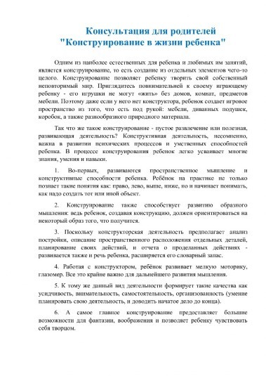 Консультация для родителей "Конструирование в жизни ребёнка". Старший дошкольный возраста.