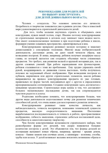 Рекомендации для родителей по выбору конструктора для детей дошкольного возраста.